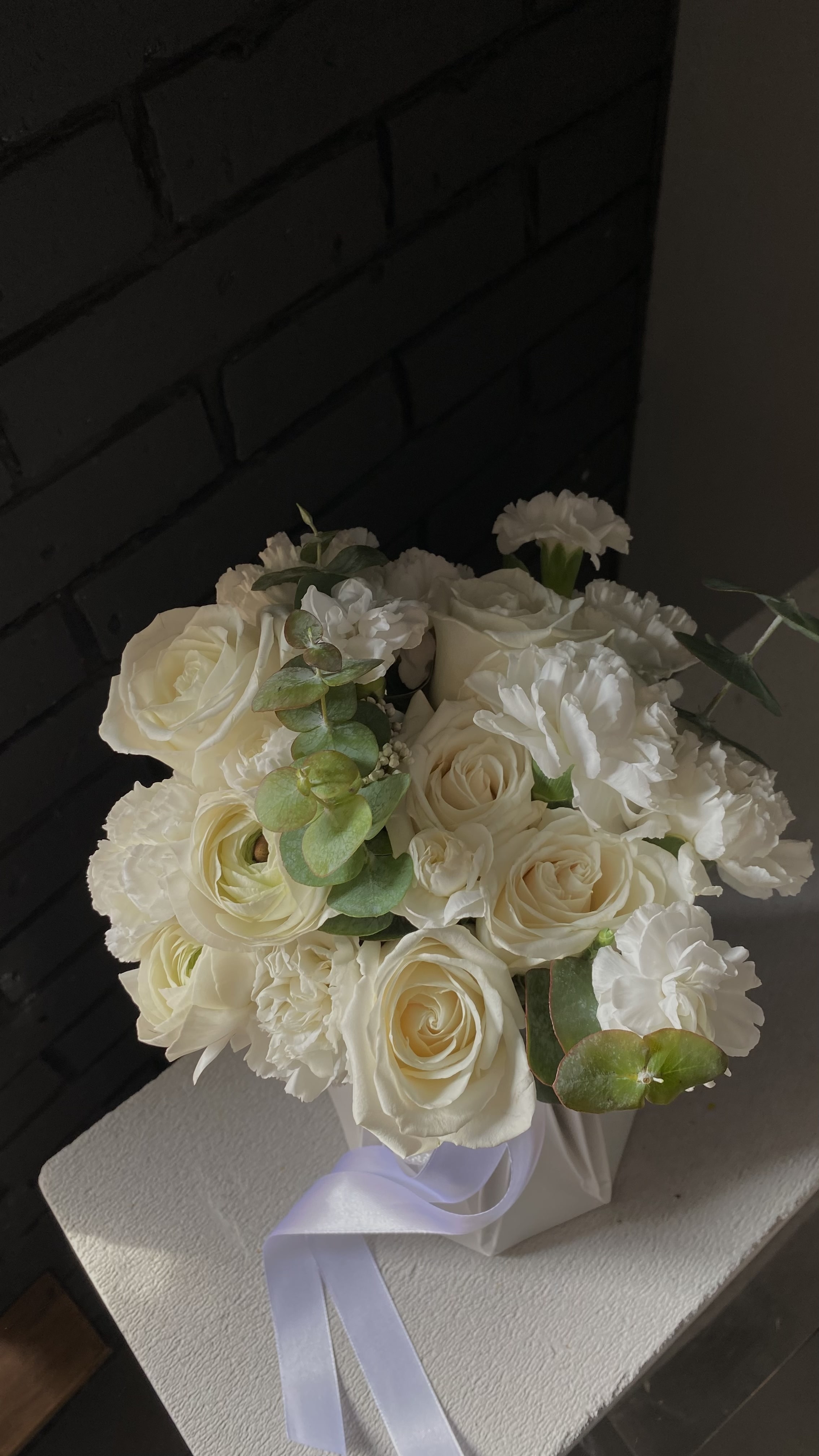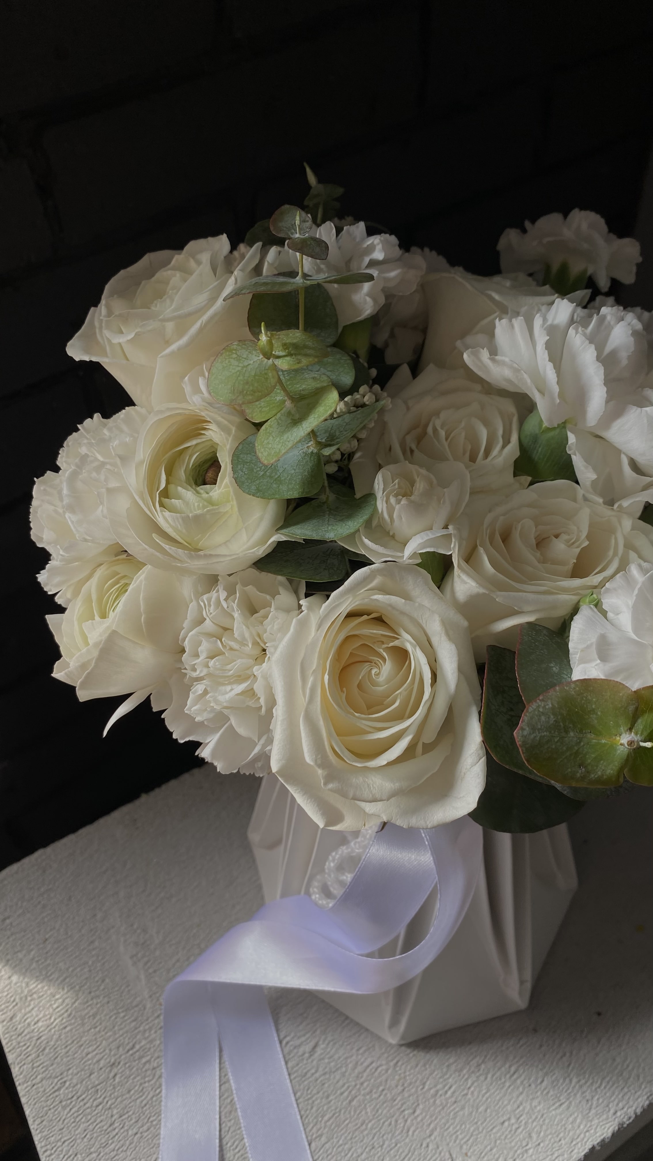 цветы сейчас в аквабоксе, но временная емкость с водой уже сыграла свою роль — аккуратно достаньте охапку, не повредив ленты, упаковку не снимайте (она удерживает форму и является частью букета)