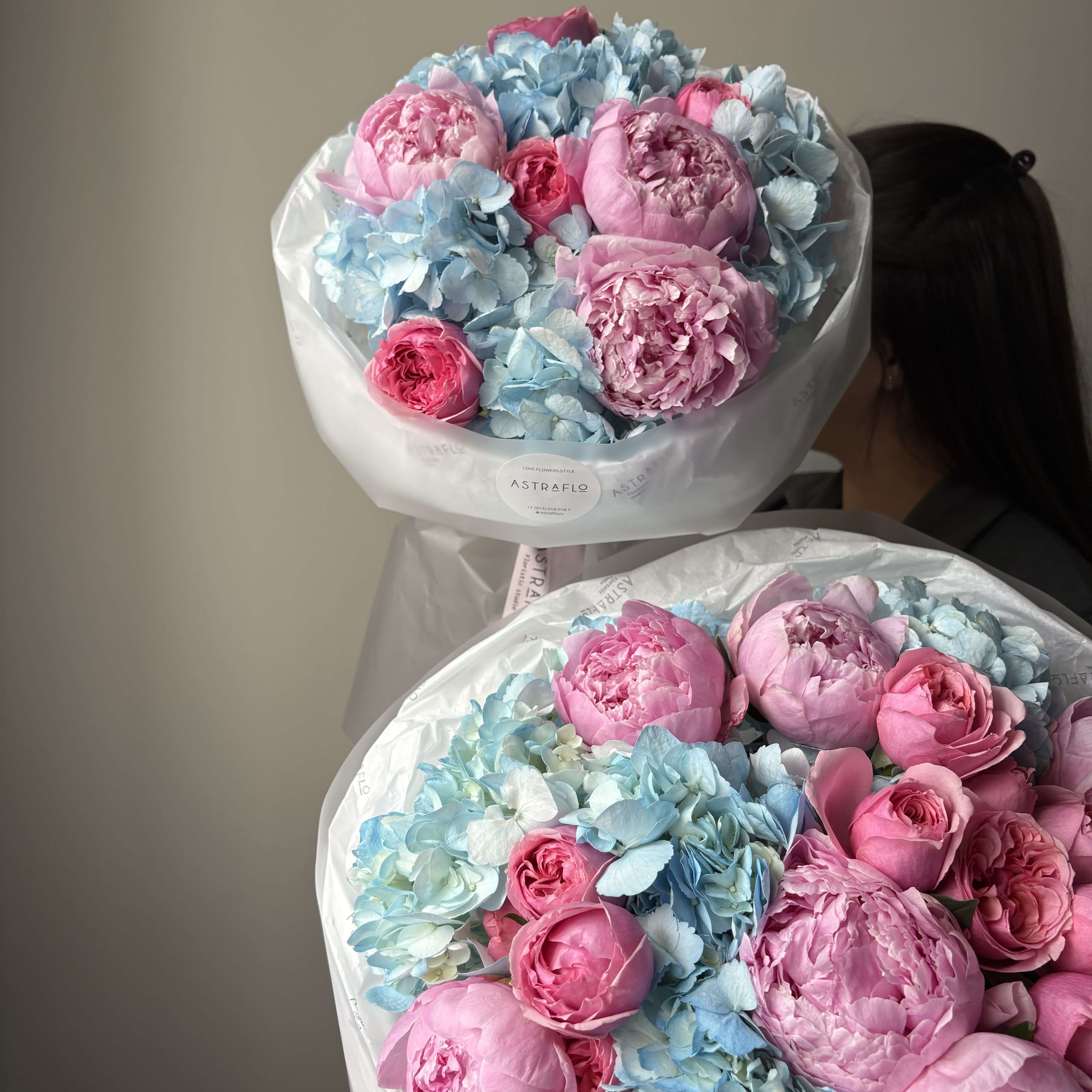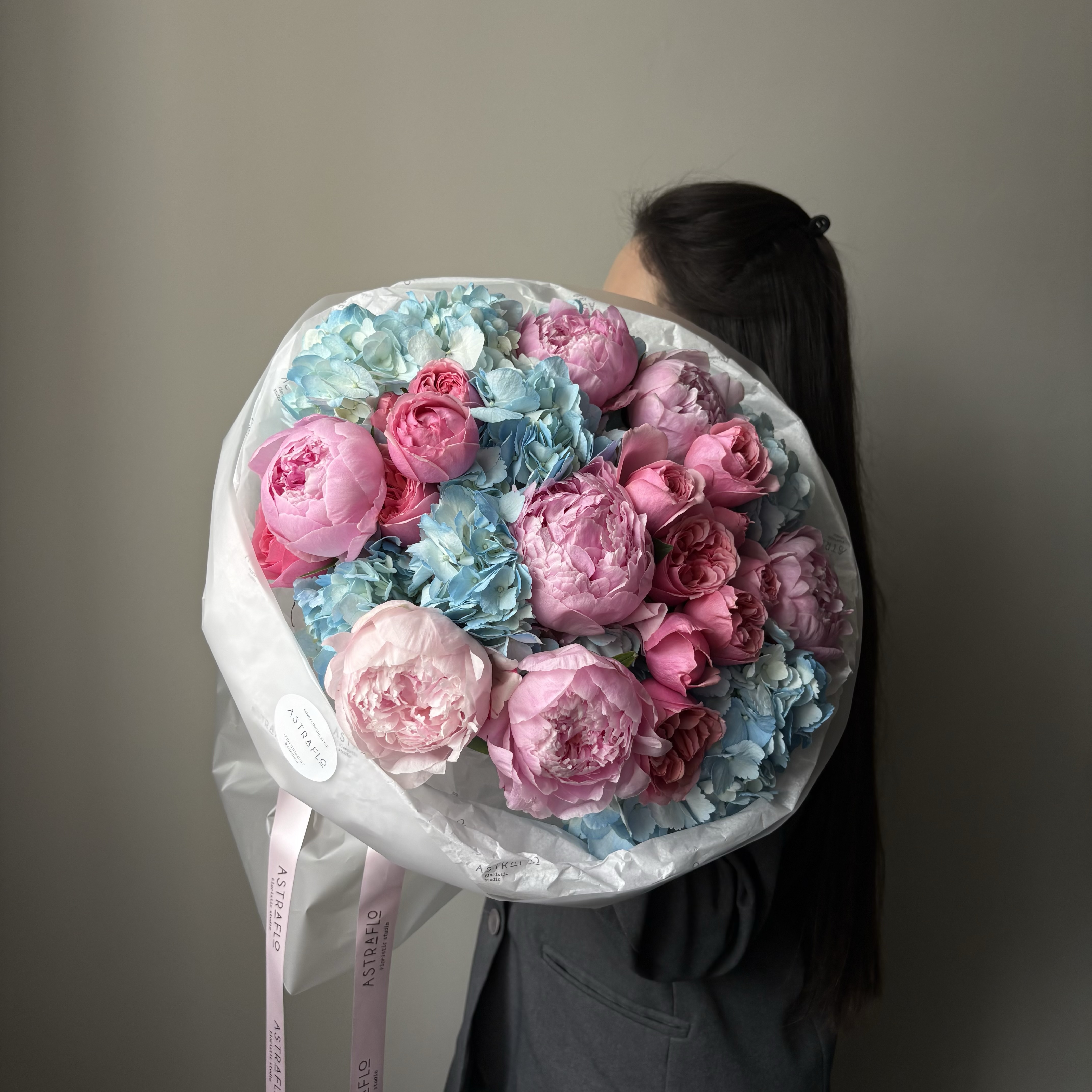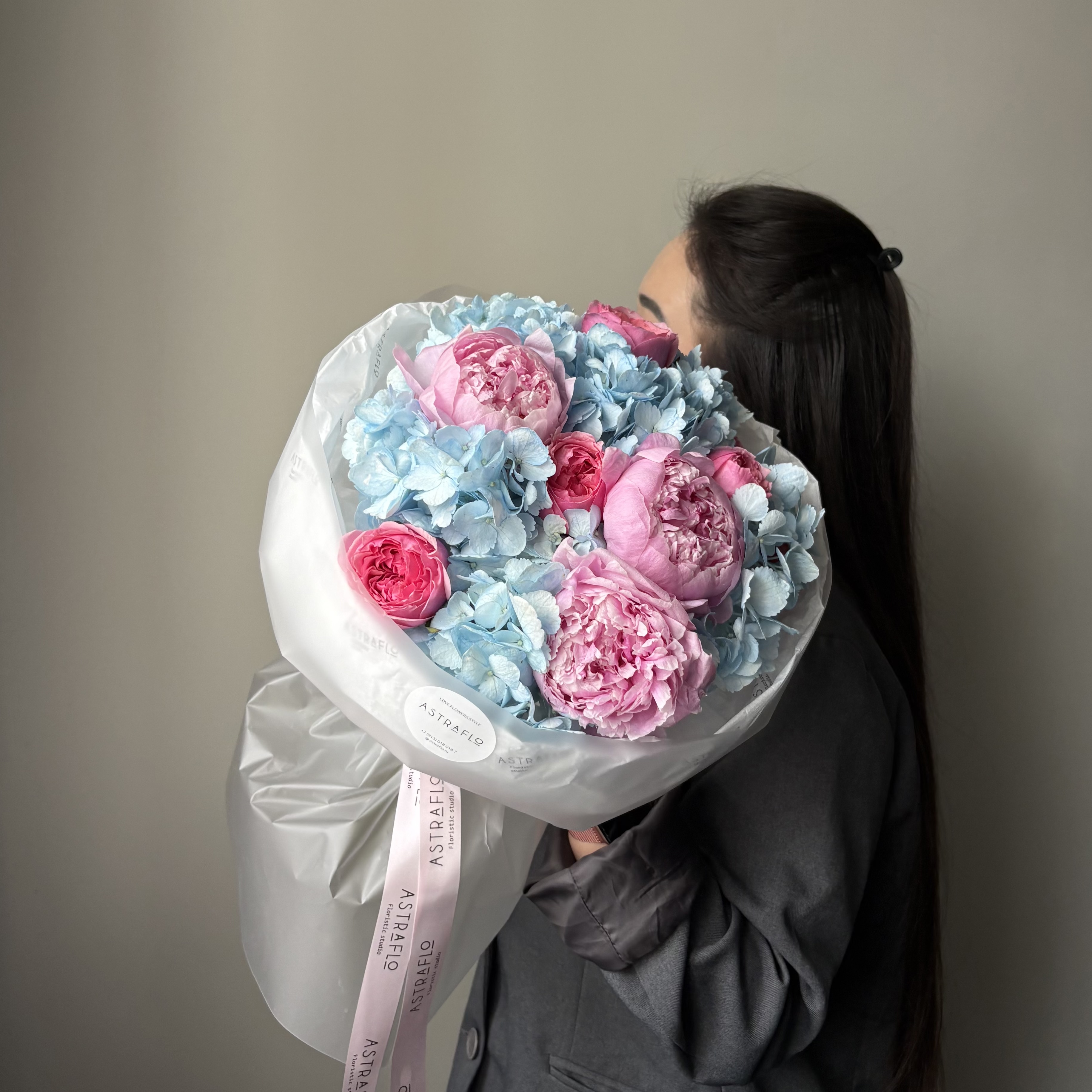 Авторский букет с голубой гортензией и розовыми пионами
